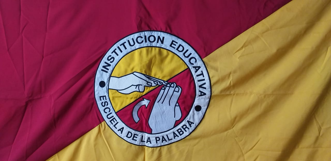 Representado mediante un círculo blanco que expresa la paz, el amor y los procesos continuos de inclusión, en éste aparece el nombre completo de la institución educativa, dentro del círculo y con gran orgullo apropiamos los colores amarillos y rojo representativo de la bandera de Pereira, nuestro municipio de origen, sobre estos colores se ilustra la seña que representa el nombre de la I.E. Escuela de la Palabra.